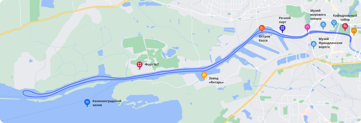 В течение трёхчасовой прогулки увидим сохранившиеся ещё с Ганзейских времён сооружения порта и современные терминалы с портовыми заводами мирового уровня, судостроительные предприятия, города и посёлки вдоль канала. Часть маршрута пройдёт водным путём, по которому Пётр I впервые прибыл в Кёнигсберг 7 мая 1697 года.